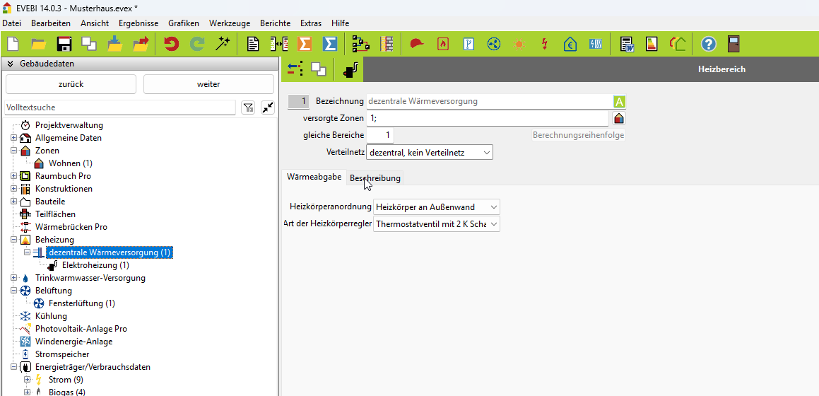 Erst einmal zur Erfassung: Beim Erfassen erstellt man einen neuen Heizbereich . Hier erstelle ich eine dezentrale Anlage ohne Verteilnetz.