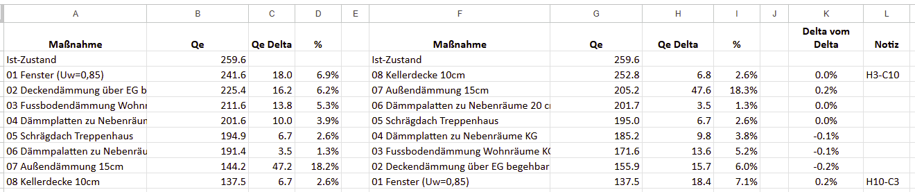 Als Beispiel wurden Einzelmaßnahmen an der Gebäudehülle angeführt. Ich habe versucht aufzuzeigen, dass für Einzelmaßnahmen an der Gebäudehülle (und nur für diese) es nicht auf die Reihenfolge ihrer Umsetzung ankommt, es führt immer zum gleichen Ergebnis. Die Ungenauigkeiten sind auf Rundungsfehler der Qe-Werte aus dem Ergebnismonitor zurückzuführen.