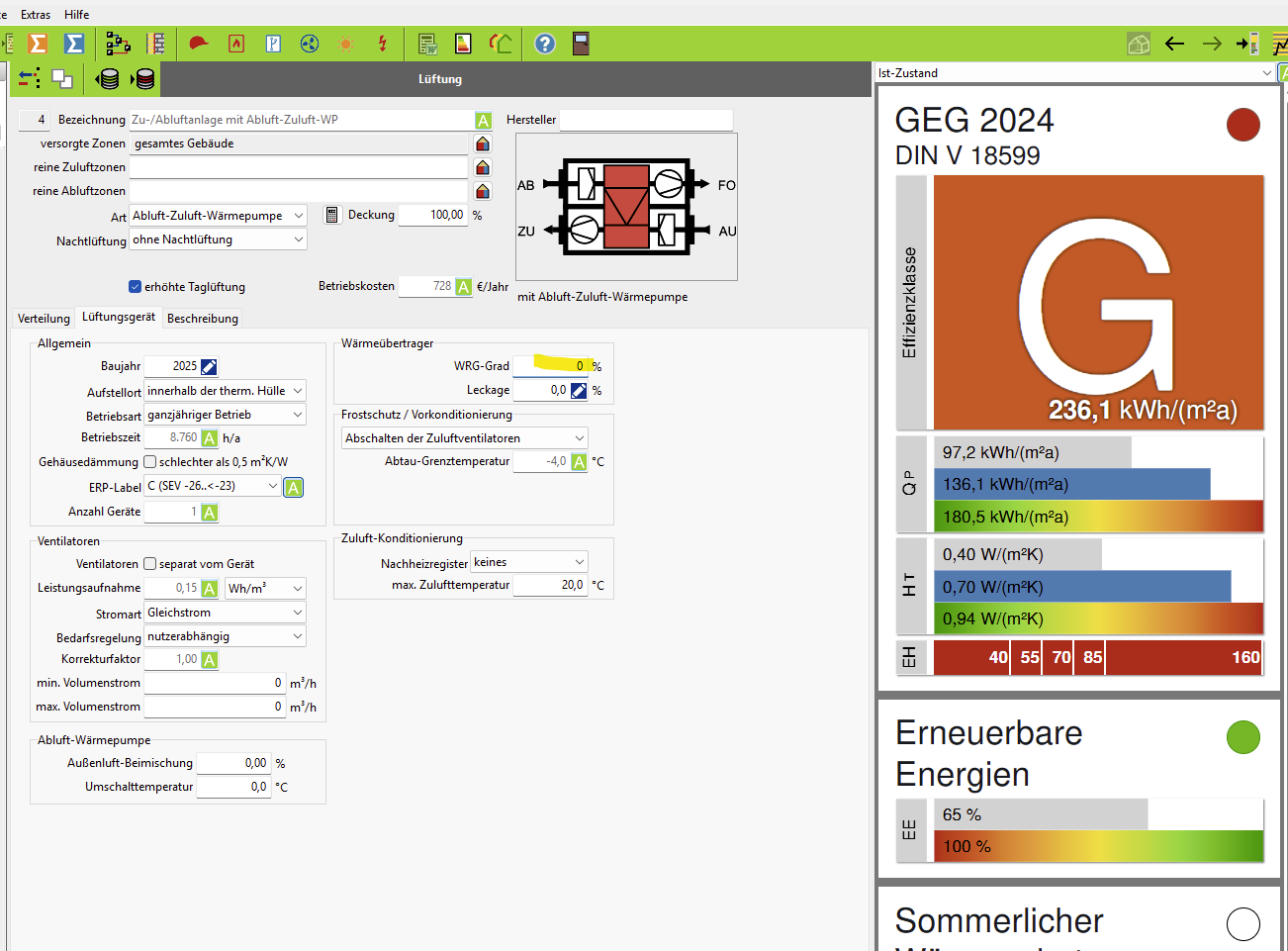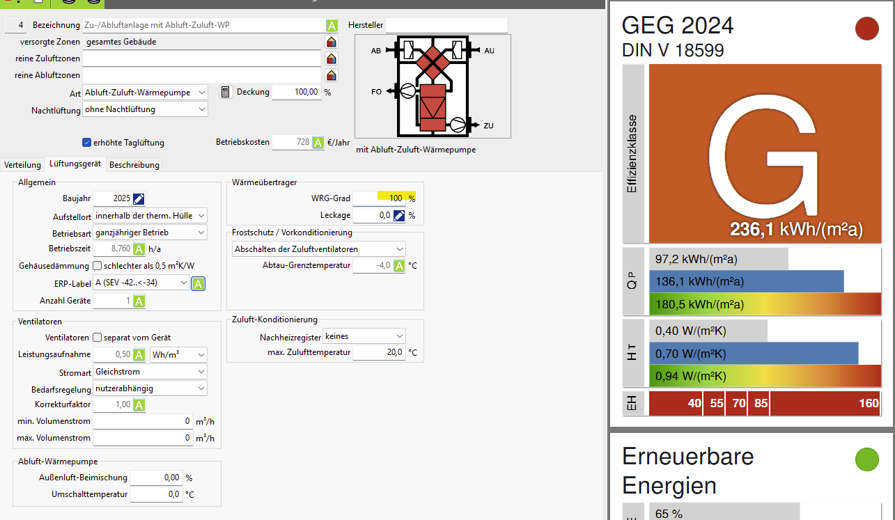 ich habe ein altes Objekt mit Lüftungsanlage mit WRG. Mir fällt gerade auf, dass wenn das Objekt nicht auf Luftdichtigkeit geprüft ist es keinen Unterschied macht, ob ich WRG-Grad 0% oder 100% eingebe. Soll das so sein? Für mich macht das irgendwie kein Sinn