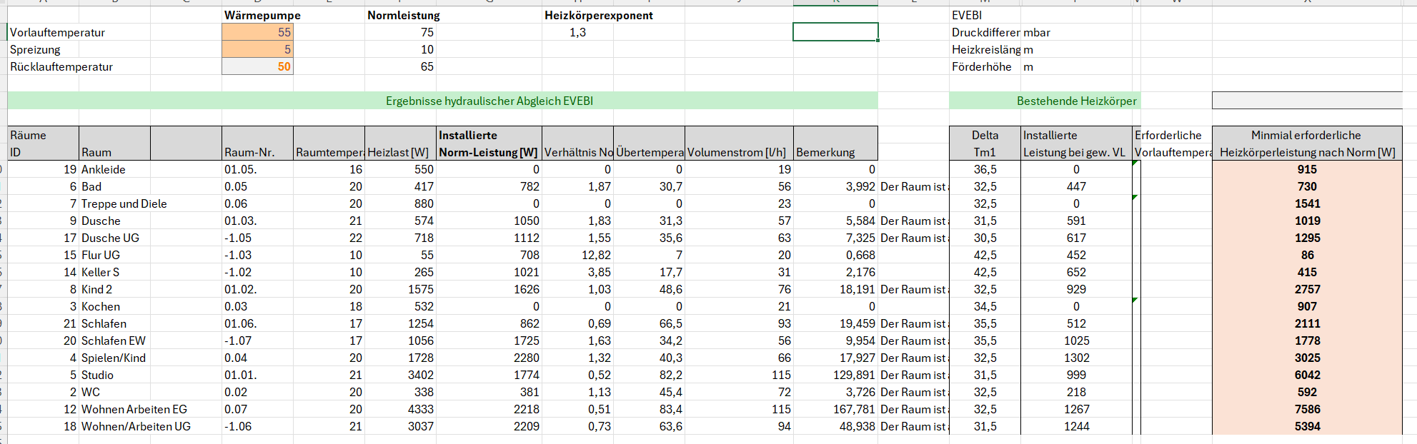 In der Übersichtstabelle vom jeweiligen hydraulischen Abgleich, erkennt man je Raum: