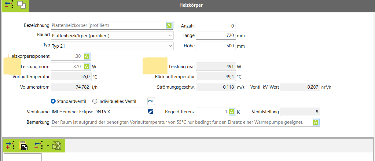 Das Problem ist das die Leistung eines Heizkörpers immer unter Normbedingungen (75/65/20) ausgegeben wird. Jede andere Vor- Rück oder Raumtemperatur ergibt eine andere Leistung. Und jetzt kommt das Problem der Spreizung. Auch diese hat Einfluss auf die Leistung des Heizkörpers (Rücklauftemperatur). Was soll das Programm den machen. Wenn die Leistung zu klein ist ? Ich habe doch nur die Möglichkeit die Leistung durch eine kleinere Spreizung zu erhöhen oder die Raumtemperatur abzusenken. Natürlich könnte Evebi automatisch die RT absenken. Aber wieweit und mit welcher Spreizung. Würde das Programm dies machen würde sich automatisch die Heizlast der angrenzenden Räume erhöhen. Dann passen eventuell dort Heizkörper nicht mehr. Einfach zu sagen die Heizlast bleibt bestehen würde ja die Realität nicht abbilden. Ich persönlich komme damit gut klar, komme allerdings auch vom Heizungsbau. Wenn ich darüber nachdenke wie wir früher über Formeln und Faktoren die Heizkörper umgerechnet haben, ist dies Top.