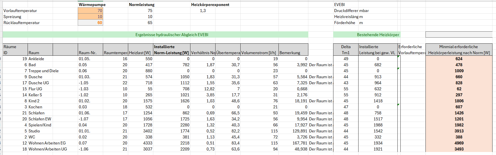 Ergebnis: Alle Heizkörper passen, außer im DG sind 3 Heizkörper zu klein