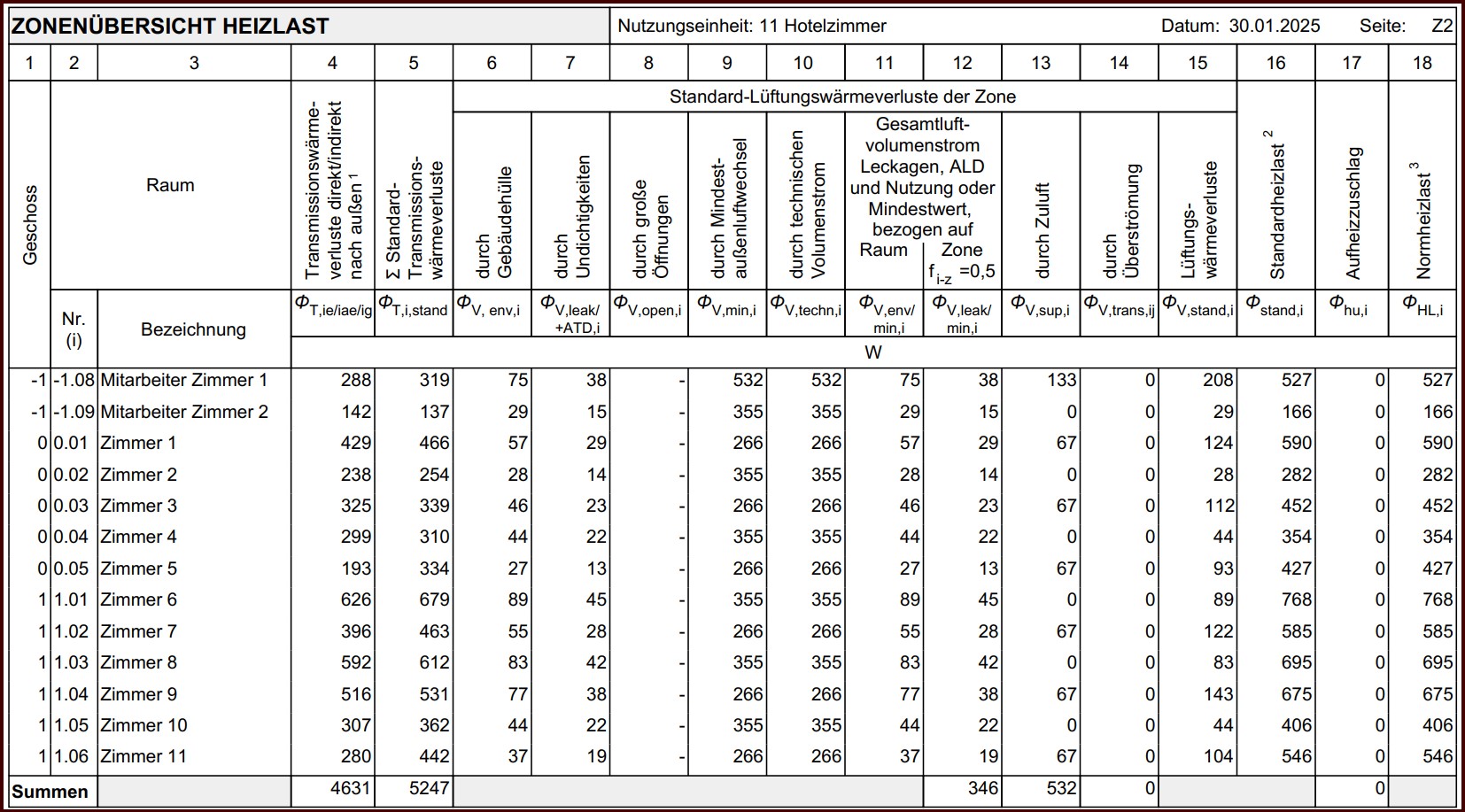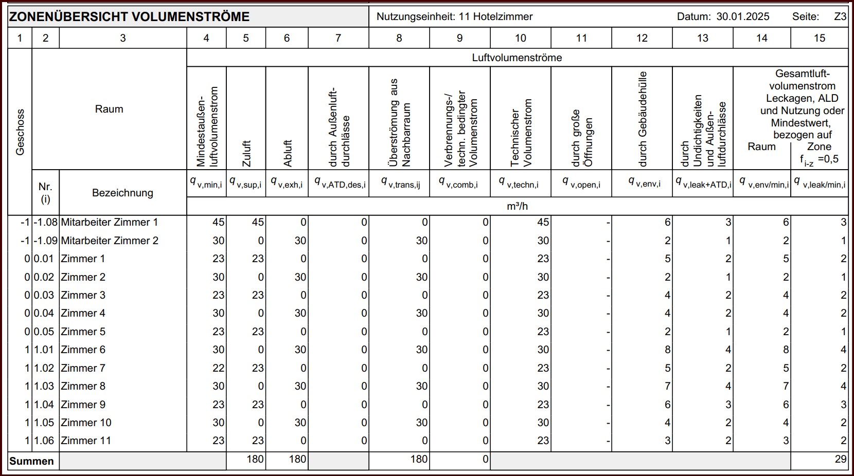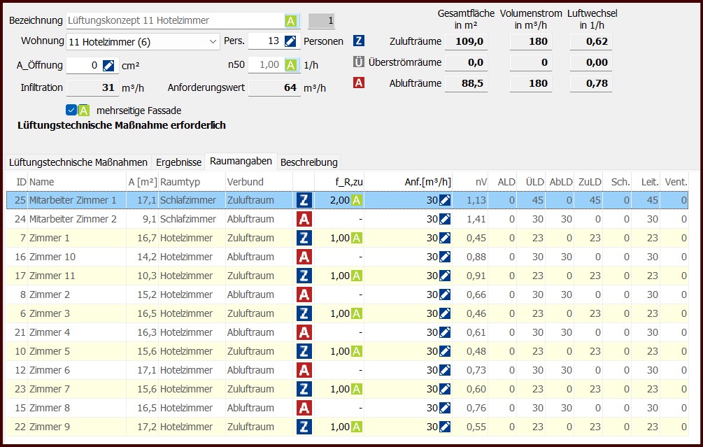 Jetzt stellt sich mir die Frage, was wo/wie eingestellt werden muss, damit eine valide Heizlastberechnung vorgenommen werden kann, welche auch den erforderlichen Mindestaußenluftvolumenstrom berücksichtigt. Aus der Online-Hilfe bin ich leider nicht schlau geworden. Die Hotelzimmer mit Nutzungsprofil 11 sind mit einer Person belegt, d.h. 30 m³/h ist vorgegebener Mindestaußenluftvolumenstrom. Erschwerend kommt hinzu, dass jedes Zimmer eine „offene“ Nasszelle hat, in der Abgesaugt wird. Die Zuluft erfolgt ebenfalls im Raum an anderer Stelle. Ich habe mir jetzt damit geholfen, dass ich z.B. das Zimmer 1 als Zuluft, das Zimmer 2 als Abluft konfiguriere. Alle Zimmertüren zum Flur sind mit LDL konfiguriert. Wie sieht die Lösung meines Problems aus?