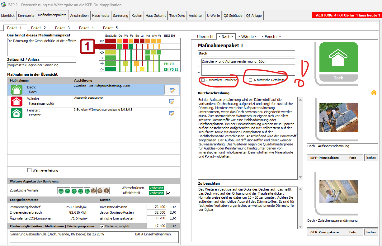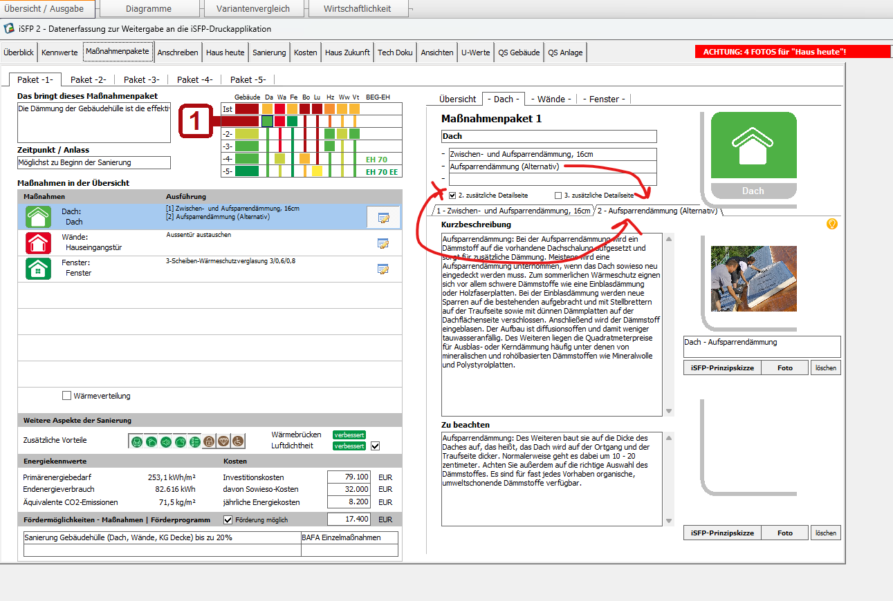 ganz vorsichtig gestellte Frage meinerseits, ob es nicht doch irgendwann möglich wäre (falls ja noch irgendjemand dies sinnvoll findet…) eine weitere Detailseite in der ISFP Erstellung anzulegen. Z.B. um fenster und Türen zu trennen, eine PV Anlage zu beschreiben, alternative dämmmassaven beschreiben (zb Aufsparrendämmung oder zwischen u. Untersparrendämmung), etc… Fehlt schon sehr.