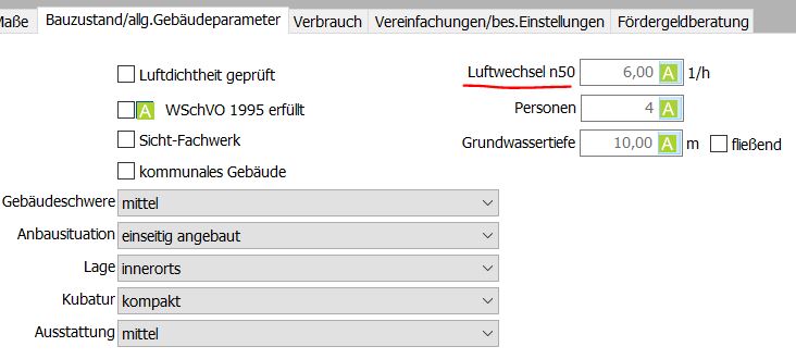 die Angabe der Luftwechselrate n50 unter „Allgemeine Daten/Bauzustand…“ erscheint mir fehlerhaft im Automatikmodus: Verwende ich die automatische Einstellung, wie im Bild angegeben, erscheint dort 6 pro Stunde und bekomme damit im Ergebnis-Monitor beim Infiltrationsvolumenstrom z.B. 50m³/h angezeigt. Stelle ich allerdings 6 pro Stunde manuell ein, bekomme ich einen viel höheren Wert, bei mir z.B. 203 m³/h.
