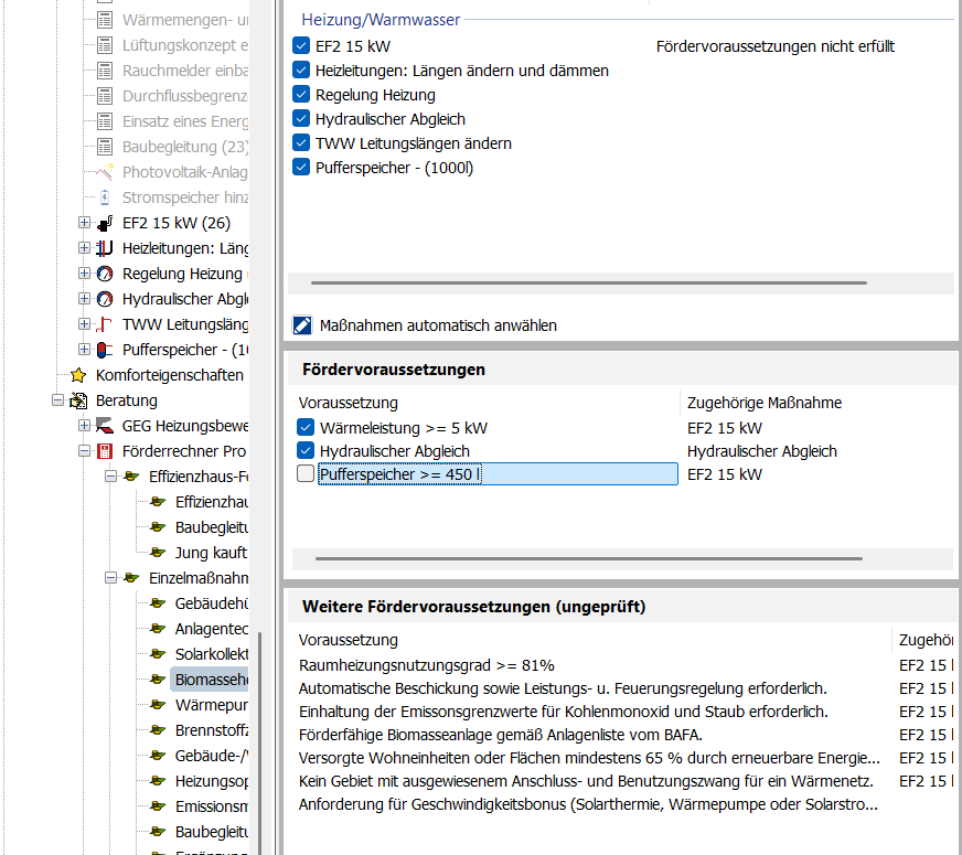 Ich hab nu erst den kleinen Puffer drin gehabt, da war es logisch, dass er das nicht kann. Nun den 1000l Puffer und er wird immer nnoch nicht erkannt. Ausgewählt als „Pufferspeicher ersetzen“. Weder als Maßnahme angehakt (manuell möglich) noch in den Förderbedingungen erkannt, da steht immernoch Puffe >450L muss sein. Ja! Ist ja drin?!