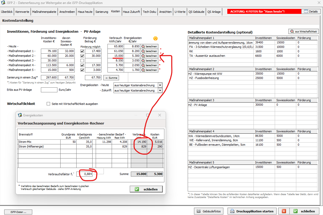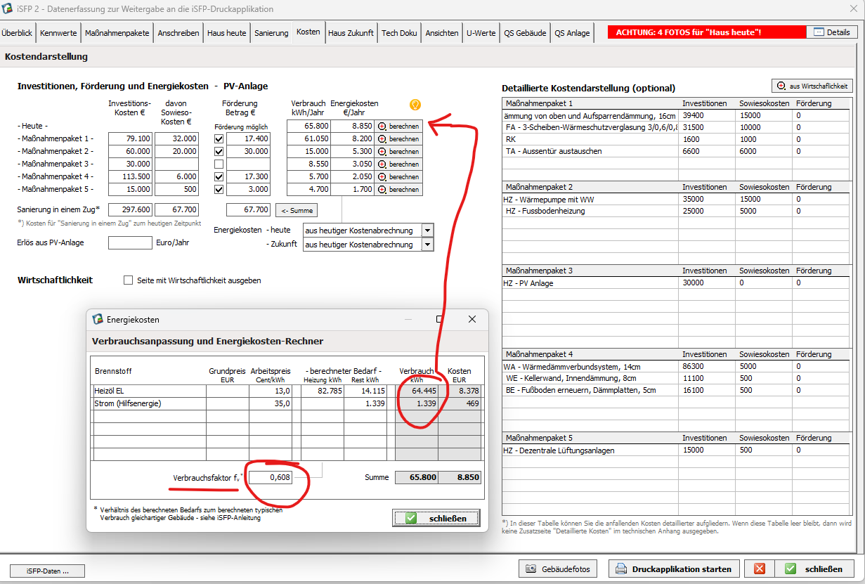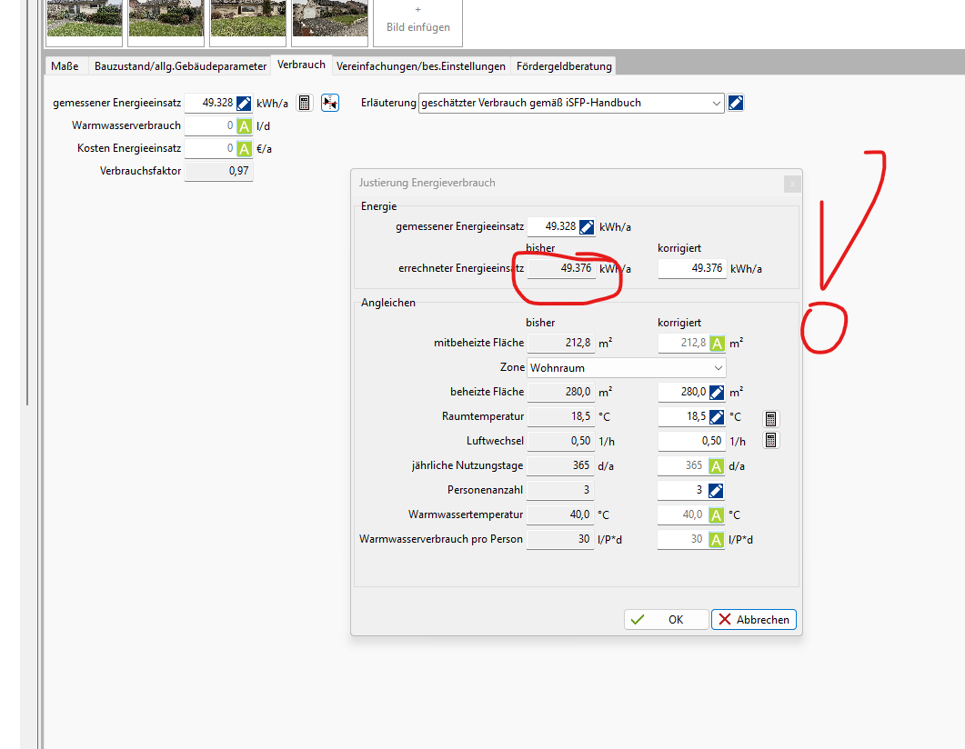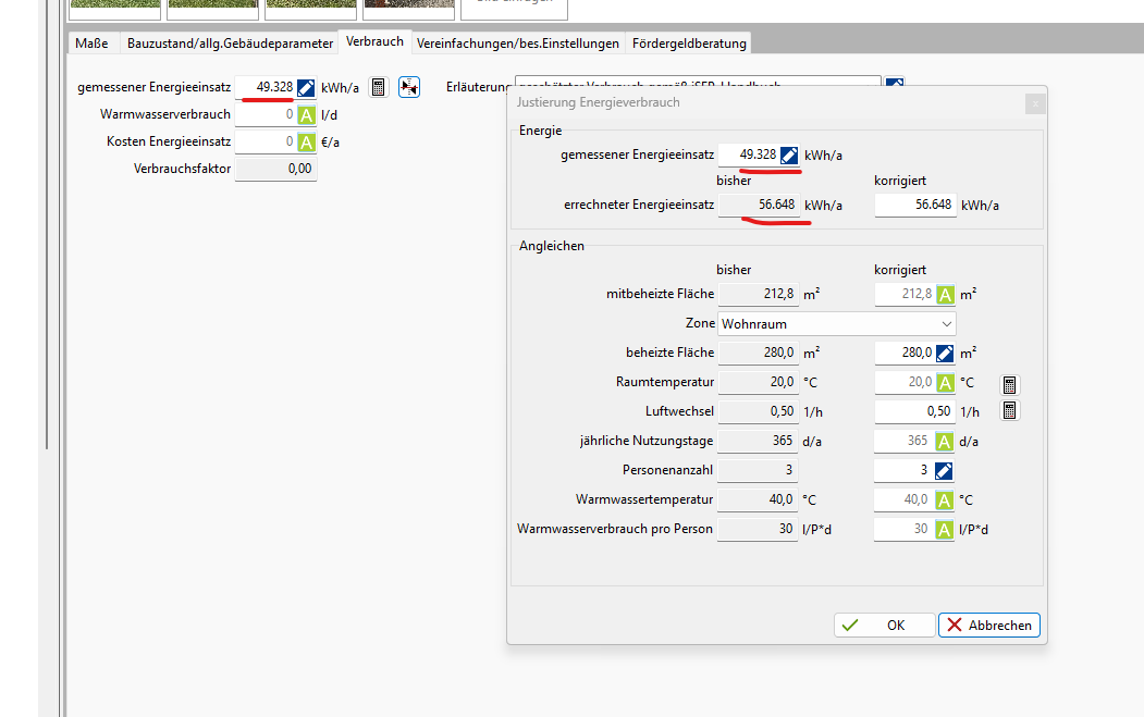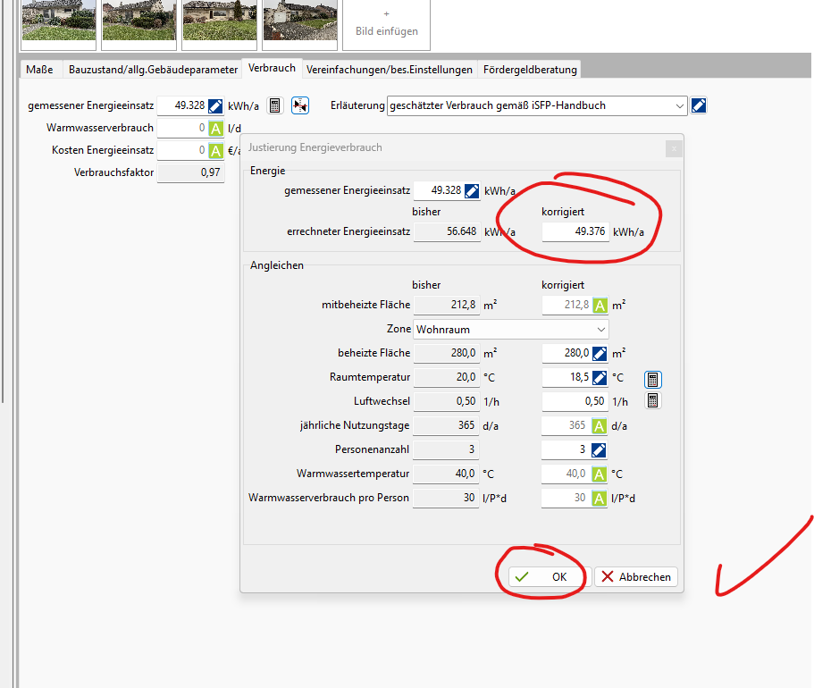 - Den gemessenen Energieverbrauch nach isfp ermitteln lassen, falls dieser nicht vorliegt. Ok…machen wir. Ich korrigiere jedoch den Verbrach an dieser Stelle absichtlich noch nicht.