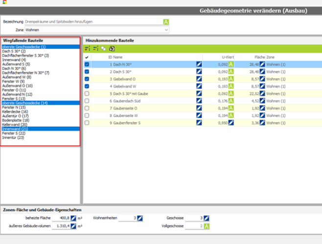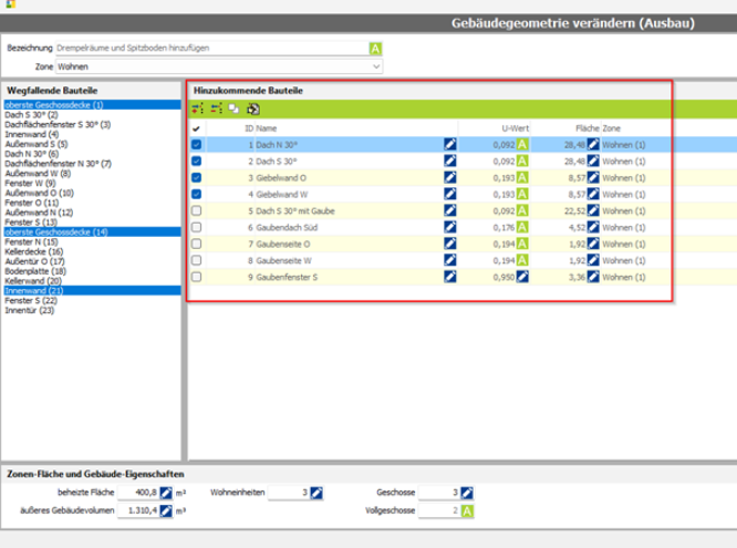 Sind alle neuen Bauteile angelegt, so müssen noch die Angaben unter „Zonen- Flächen und Gebäude- Eigenschaften“ angepasst werden. Das geschieht nicht automatisch.