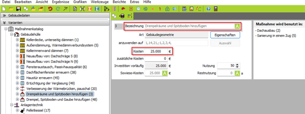 Diese Maßnahme finden Sie unter Varianten → Maßnahmenkatalog → Bauteile → Gebäudegeometrie → Ausbau/Umbau. Legen Sie die Maßnahme an.